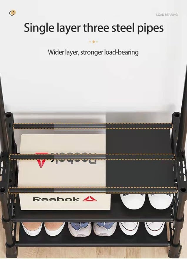 Organize your clothes neatly and efficiently with this Floor‑Standing Clothes Rack, designed to provide smart storage while saving floor space. Featuring a sturdy hanging rod and multiple lower shelves, this rack allows you to hang garments while also storing folded clothes, bags, or accessories in one place.
