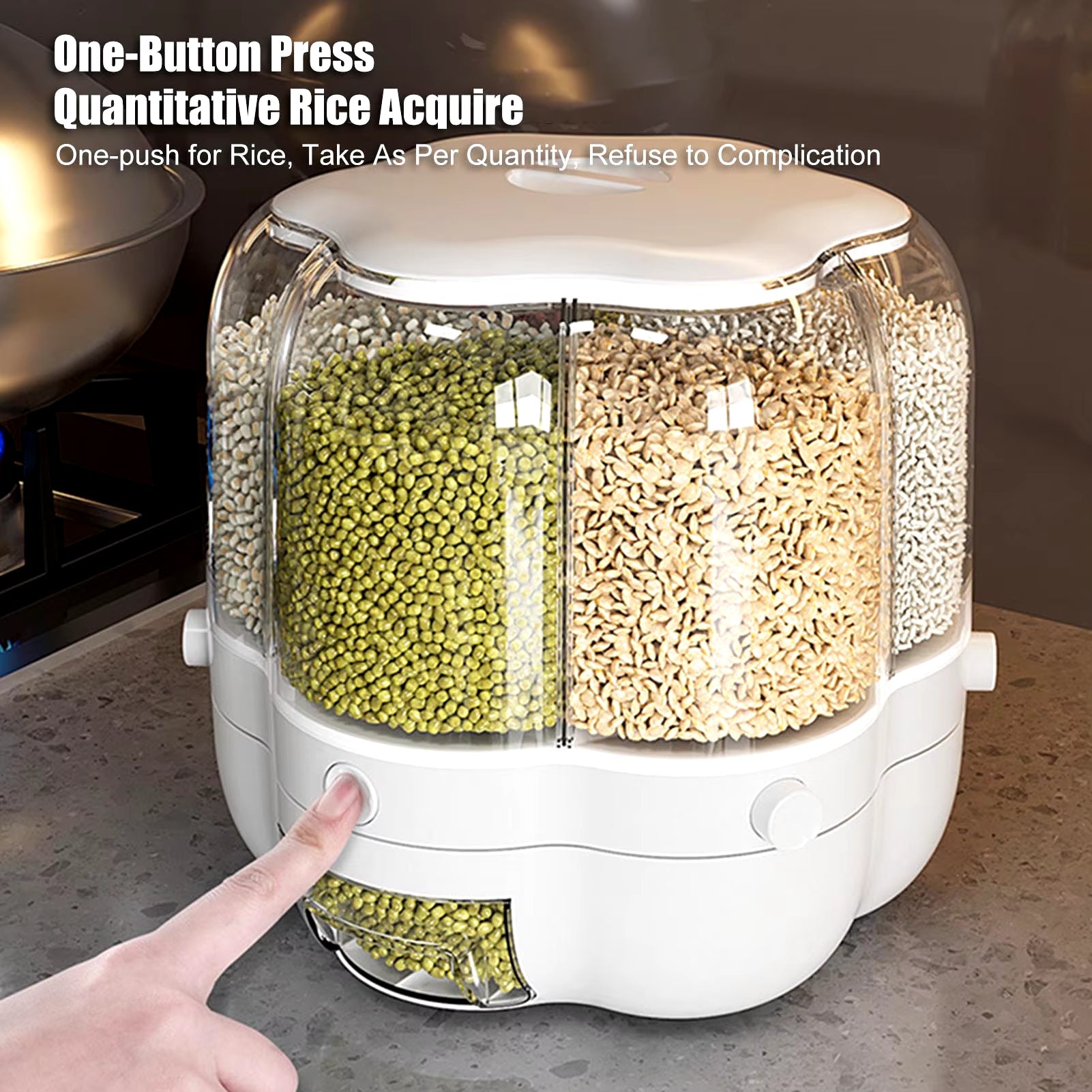 The multi‑section internal design lets you store different grains separately in a single compact unit. Its transparent body provides instant visibility, while the airtight construction helps keep contents fresh and protected from moisture and insects. With smooth 360° rotation, selecting the right grain is quick and effortless.